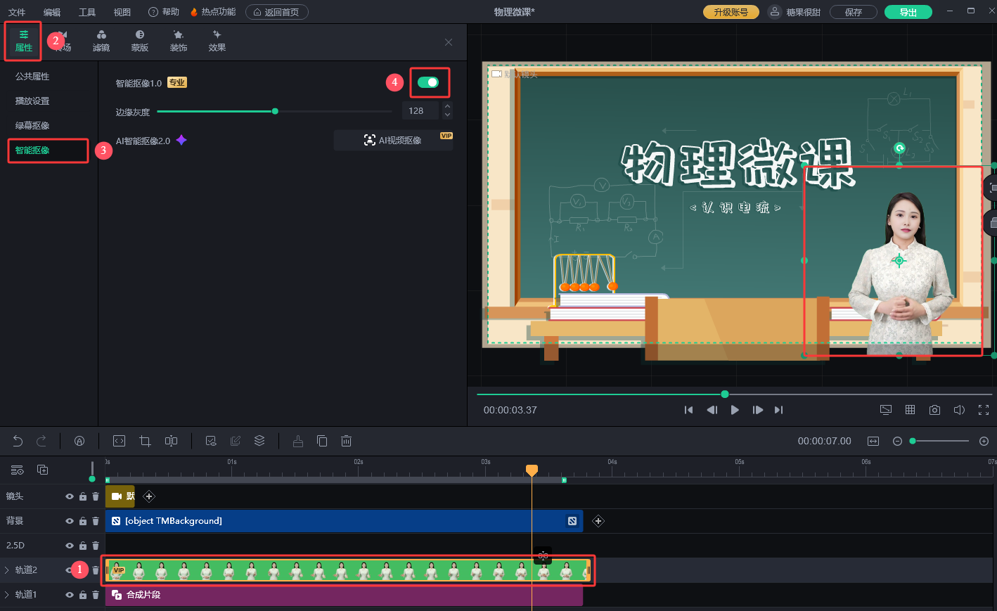 3)轨道上,点击选中视频,在属性 >> 抠像栏中,点击【智能抠像】开启按钮,一键开启智能抠像;