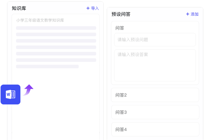 支持预设核心问答,指定标准答案,确保不同场景下回答100%专业准确,杜绝胡编乱造;同时支持上传或输入精选知识内容,让AI基于你的资料精准应答,非泛泛而谈