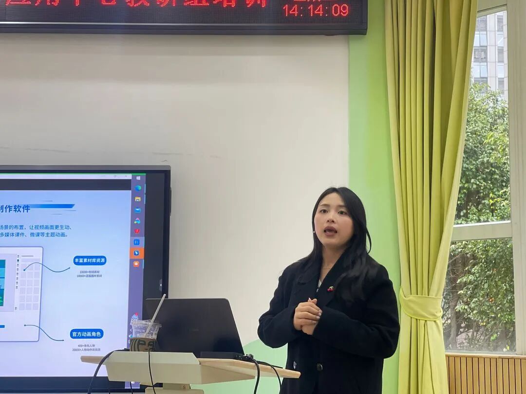 培训一开始,马泽英老师就向大家概述了万彩信息的发展历程、荣誉成就及合作伙伴等相关情况。随后,她从动画制作、办公效率提升、自媒体视频制作和AI智能生成这四大领域,详细讲解了万彩信息旗下的微课创作工具的基础操作与功能特性。通过生动的产品展示,她帮助教师们深化对微课理论知识的理解,并掌握各类微课创作的技巧。
