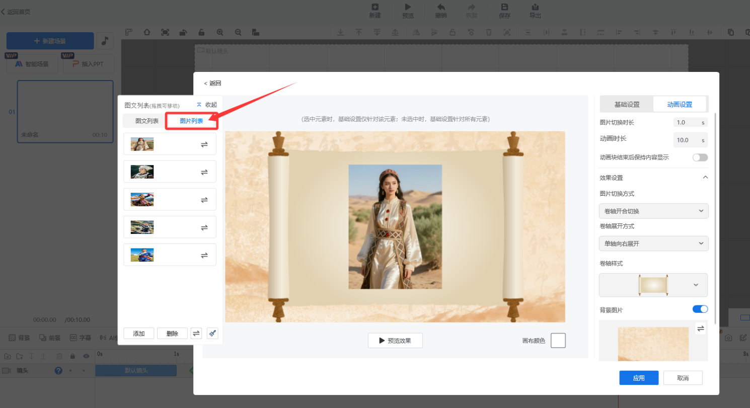 7、图文特效:卷轴展开特效增加纯图片轮播效果,支持开合卷轴切换展示多张图片