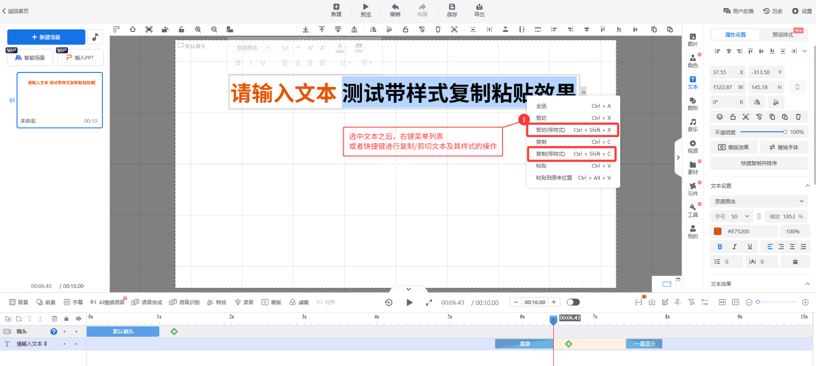 8、文本:支持一键去除文本多余宽度;支持带样式复制粘贴,可通过快捷键或右键菜单操作