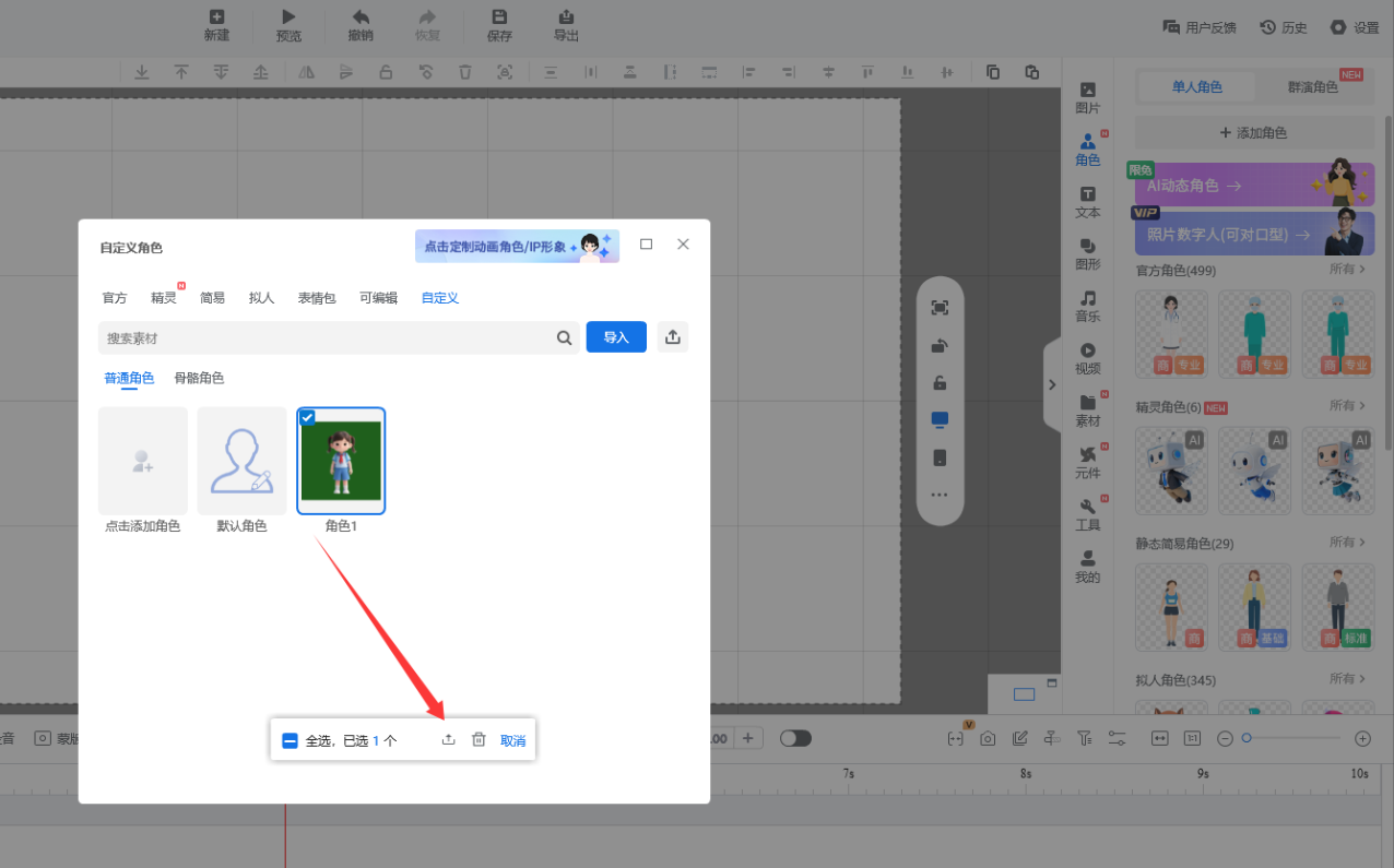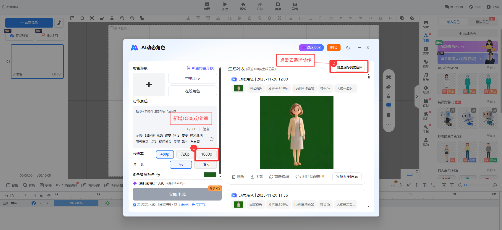 9、AI动态角色:新增1080p高清分辨率选项,并支持将生成的角色动作视频批量保存到自定义角色库,方便重复使用