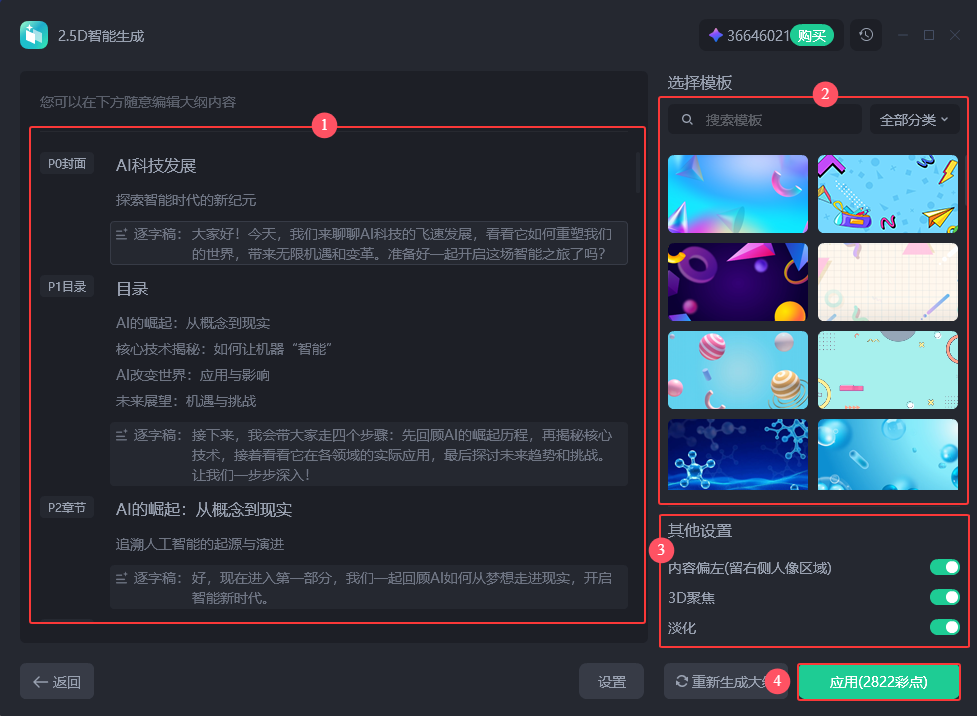 3.左侧是生成好的大纲内容,右侧可点击【全部分类】选择需要的模板类型并选中模板样式应用,在【其他设置】中,可开启3d聚焦等功能;下方【设置】可设置字体、高光、强调配置。都设置好后点击【应用】进行生成。