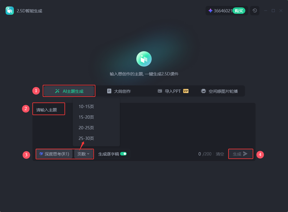 2.弹出窗口,点击【AI主题生成】输入主题后,再点击【深度思考(R1)】可选择页数,最后点击【生成】。
