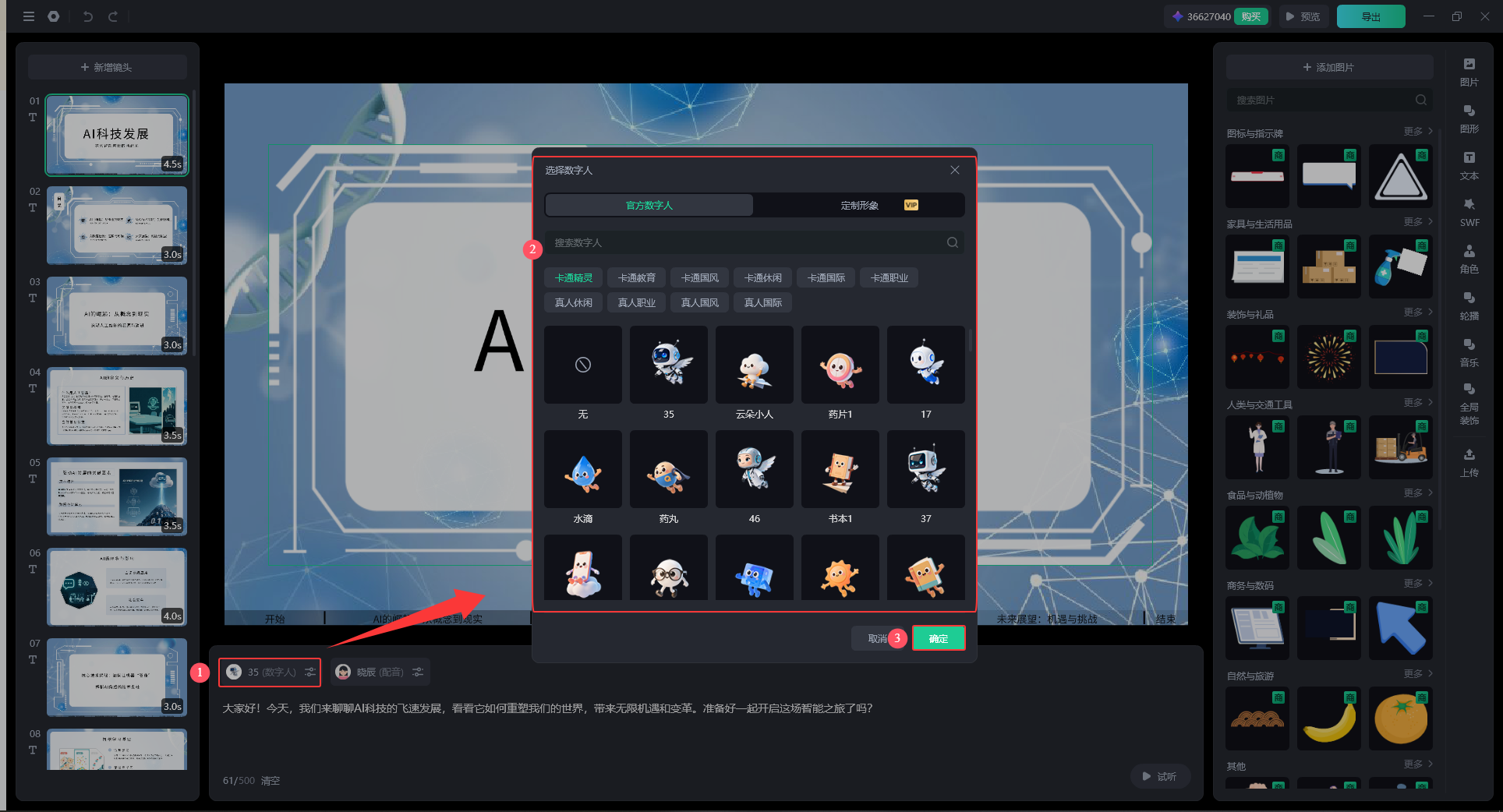 5.生成好后,模板中可以添加数字人,点击【数字人】弹出窗口选择数字人,可以选择【官方数字人】也可以选择【定制形象】,覆盖精灵、教育、国风等形象,轻松实现数字人说话。