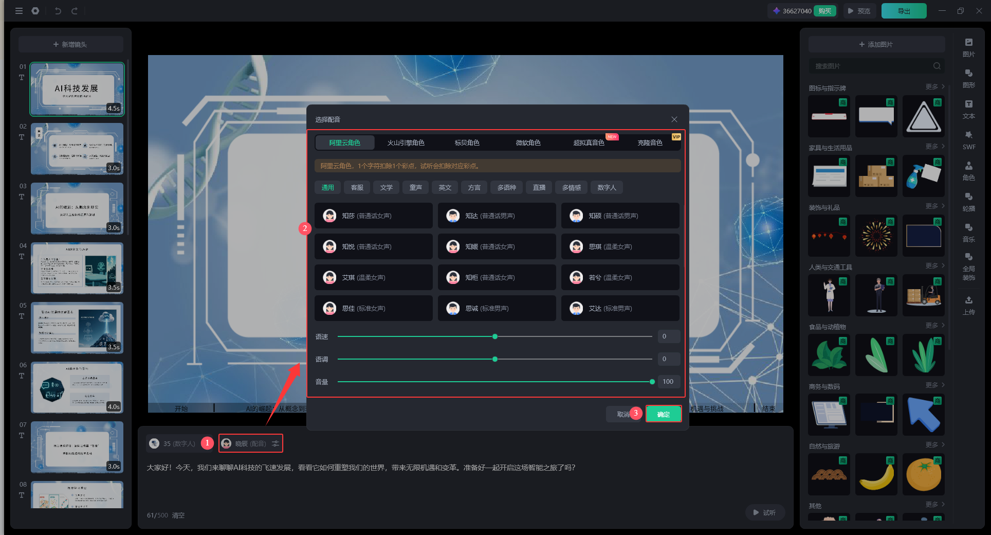 6.还可以添加配音,点击【配音】弹出窗口选择配音角色,可以选择【阿里云角色】、【火山引擎角色】、【标贝角色】、【微软角色】、【超拟真音色】以及【克隆音色】,里面覆盖了多种分类角色配音以便大家选择。