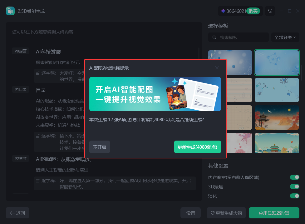4.生成过程中会弹出窗口提示是否开启AI智能配图,点击【继续生成】即扣除彩点并开启AI智能配图后继续生成;点击【不开启】即不开启AI智能配图后继续生成。