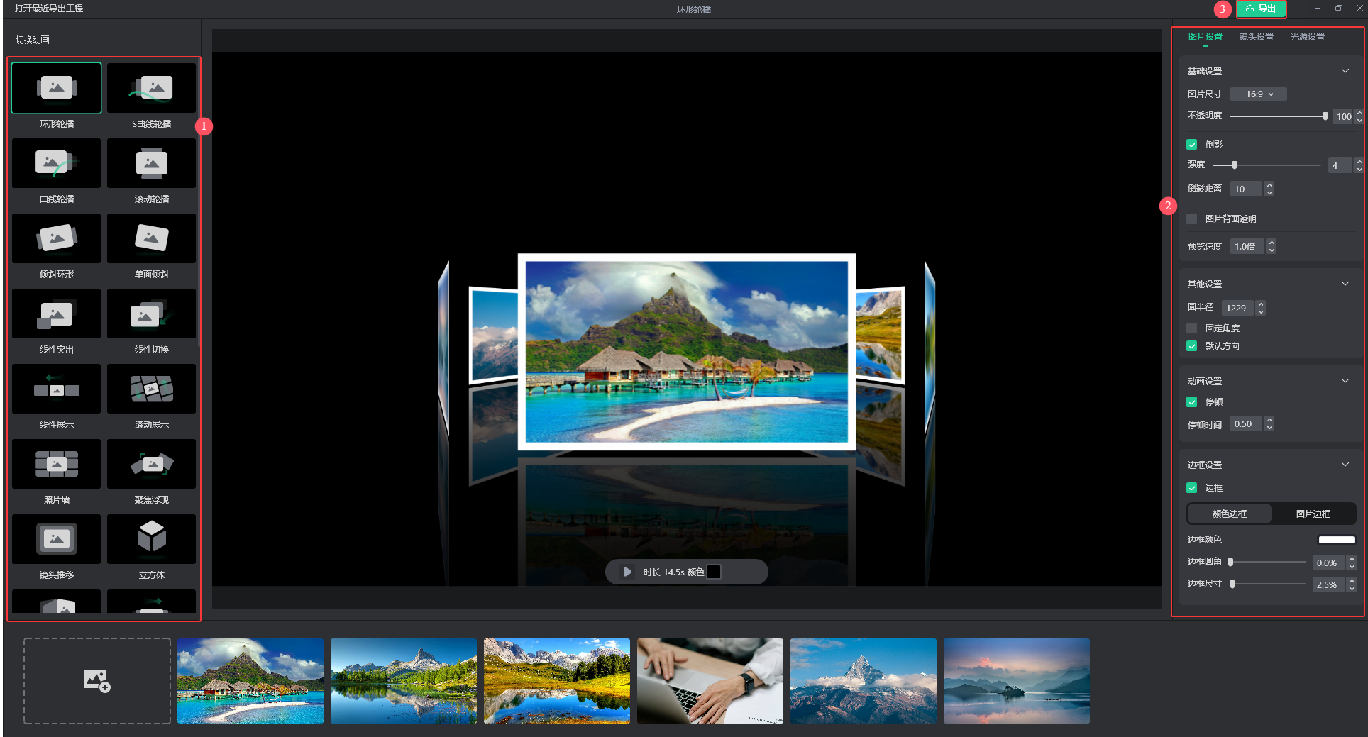 4.左侧工具栏设置切换不同的动画,还可以进行图片、镜头和光源的基本设置,设置好后点击【导出】即可