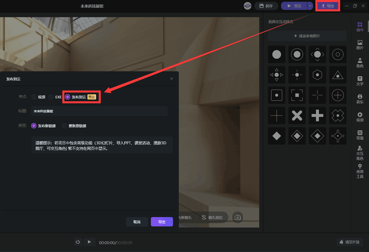 1、【NEW】一键发布H5网页:“导出到云" 功能重磅上线!只需一键,即可将课件变为在线H5网页,轻松插入到PPT/希沃/Focusky等软件中,让VR全景交互赋能您的课件!
